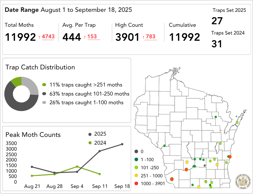 DATCP's fall armyworm trap network monitored late summer moth migration flights for seven weeks, from August 1 to September 18. During the 2025 survey, the 27 network traps captured a cumulative total of 11,992 moths, or an average of 444 moths per trap. Most of the traps registered seven-week totals of 250 moths or less, though four sites in Grant, Sauk, and Sheboygan counties captured 1,000 or more moths. The heaviest flights were documented in the southwest area September 5 to 18, and the single highest cumulative count was 3,901 moths at Lancaster in Grant County. The September flights occurred too late to produce damaging larval populations and, unlike the true armyworm which reached outbreak levels in July, fall armyworm was not a major threat to crop production in Wisconsin this season.
