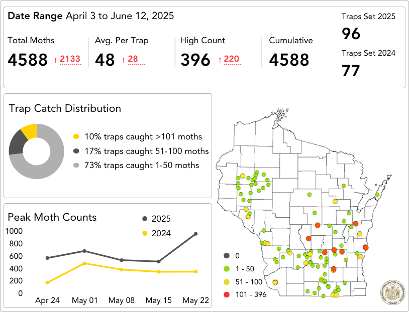 and locally heavy moth counts, Wisconsin's risk factors for black cutworm infestation did not fully align and extensive cutworm damage to seedling corn was not reported or observed in 2025. A dashboard summarizing cumulative trap counts and peak catch data is provided below.